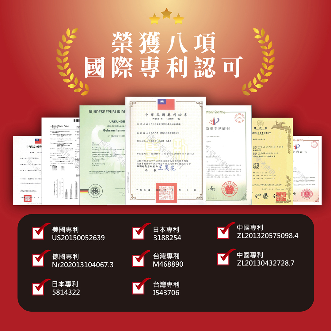 美國匹茲堡發明獎金牌 ∣	瑞士日內瓦發明獎銀牌 ∣	德國紐倫堡發明獎銀牌