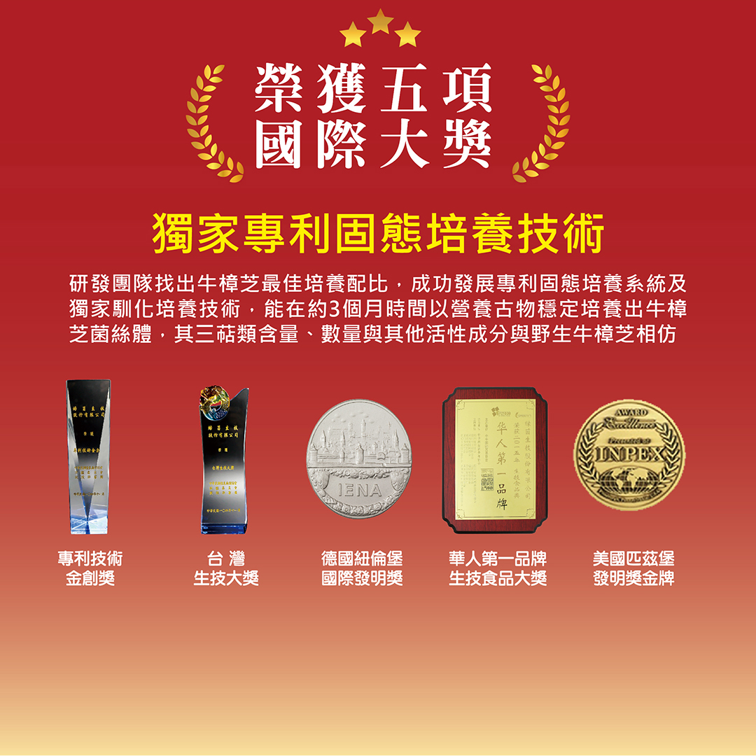 研發團隊歷經數十萬組以上的穀物培養基測試,找出牛樟芝最佳培養配比,成功發展專利固態培養系統及獨家馴化培養技術,能在約3個月時間以營養穀物穩定培養出牛樟芝菌絲體。