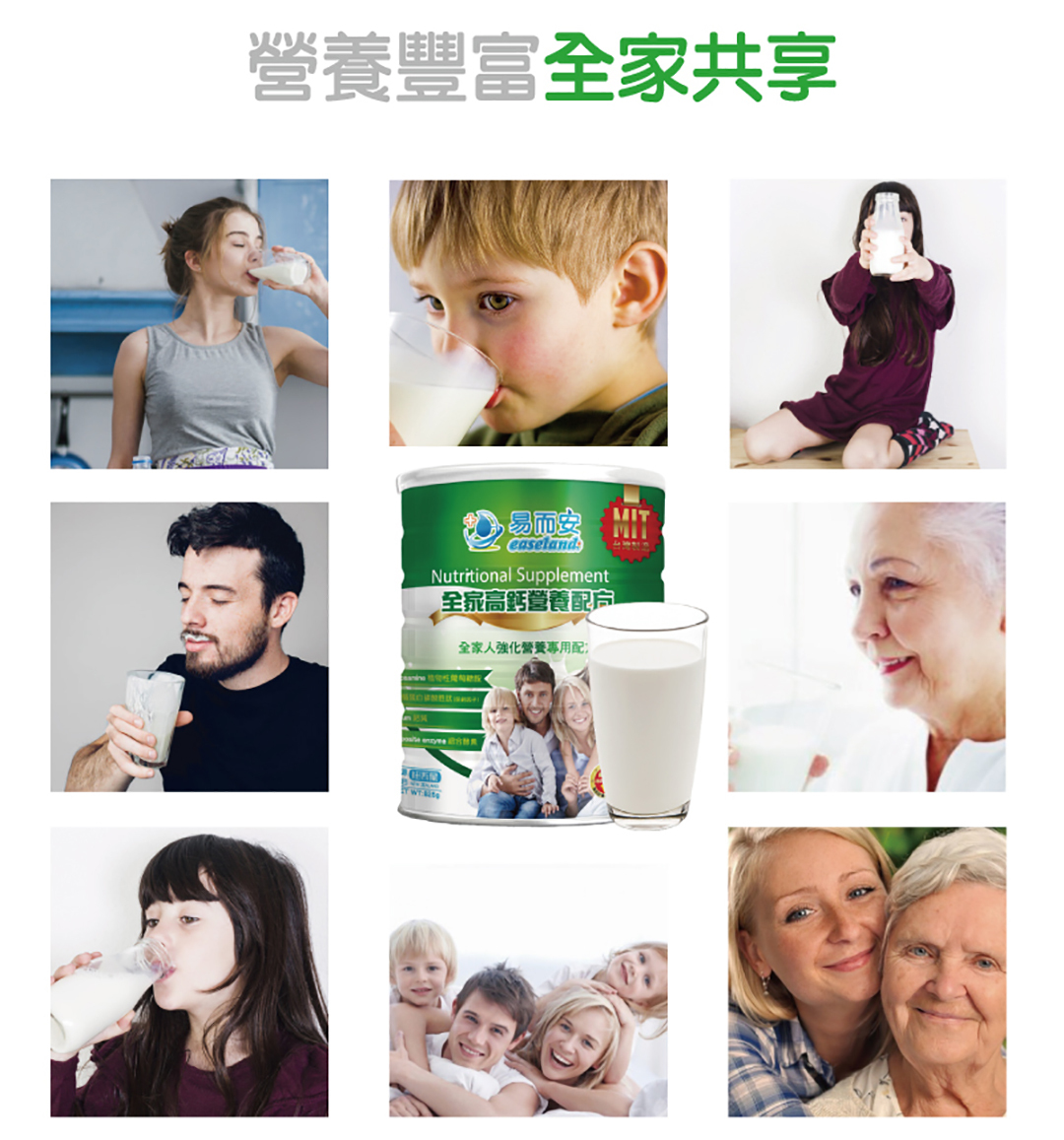 易而安全家高鈣營養奶粉特別添加:乳鐵蛋白、藻精蛋白、乳清蛋白、茄紅素、葡萄仔(OPC); Vit D3;納豆激酶;蔓越莓、β-胡蘿蔔素、維生素A;還有獨家精選的天然益菌及乳酸菌及益菌質、菊糖等營養成分,是專為全家人所設計的養生保健奶粉。