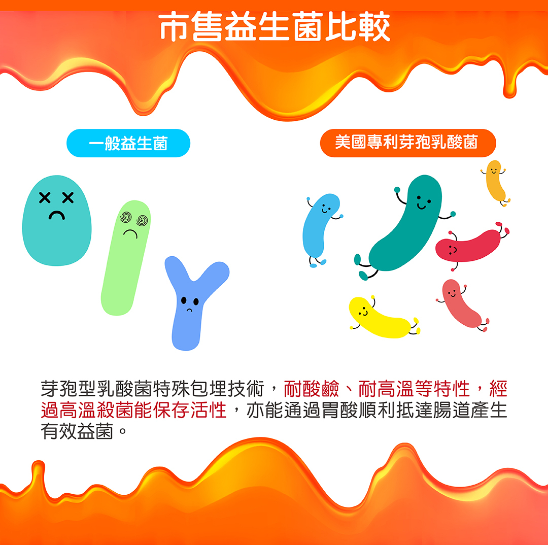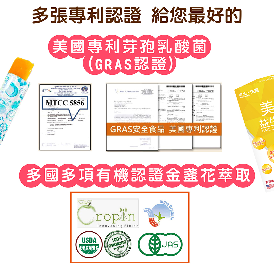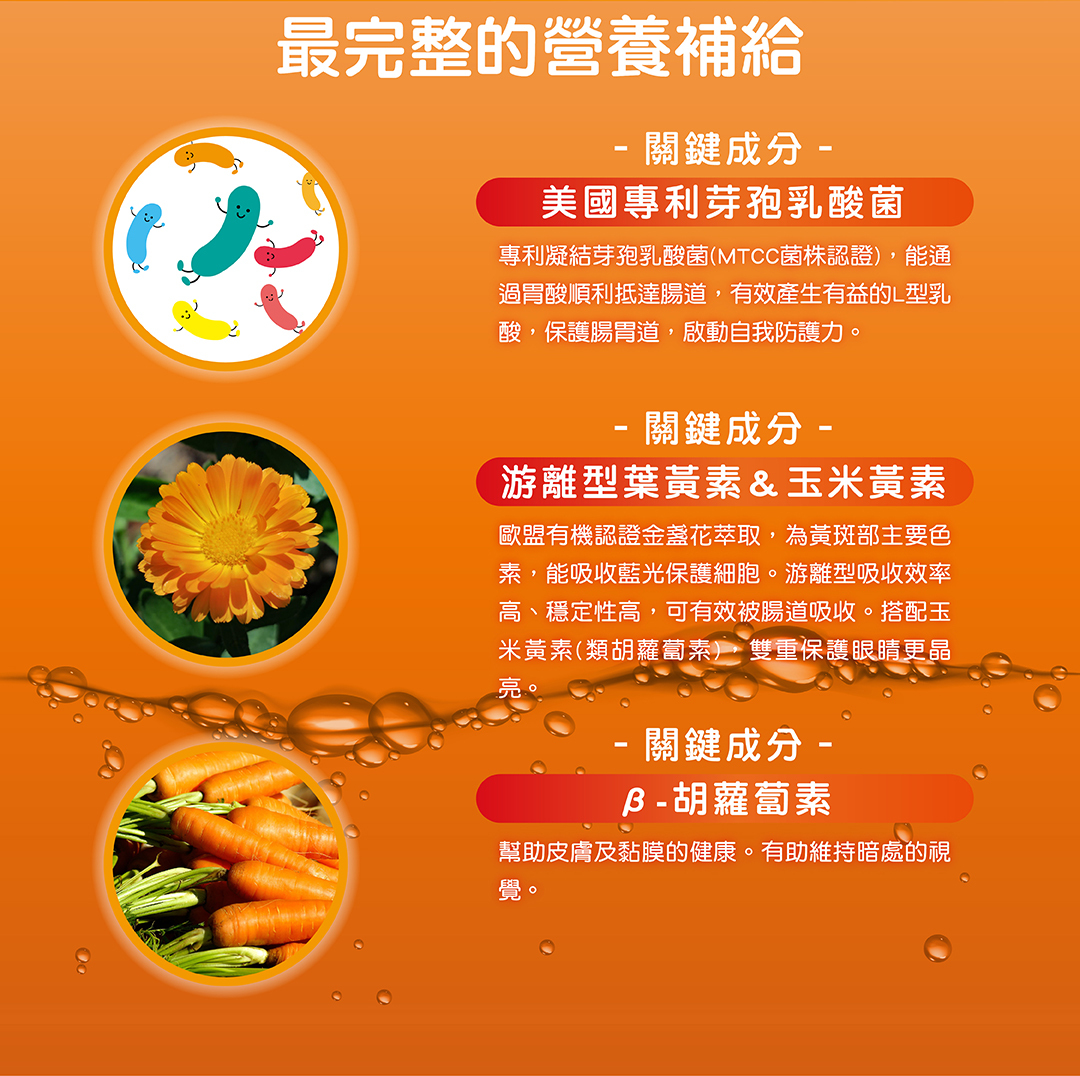 ●芽孢型乳酸菌特殊包埋技術,能通過胃酸順利抵達腸道產生有效益菌;有機認證游離型葉黃素+玉米黃素=晶亮雙重保護!果凍劑型就像吃點心一樣,同時提供身體保護力。